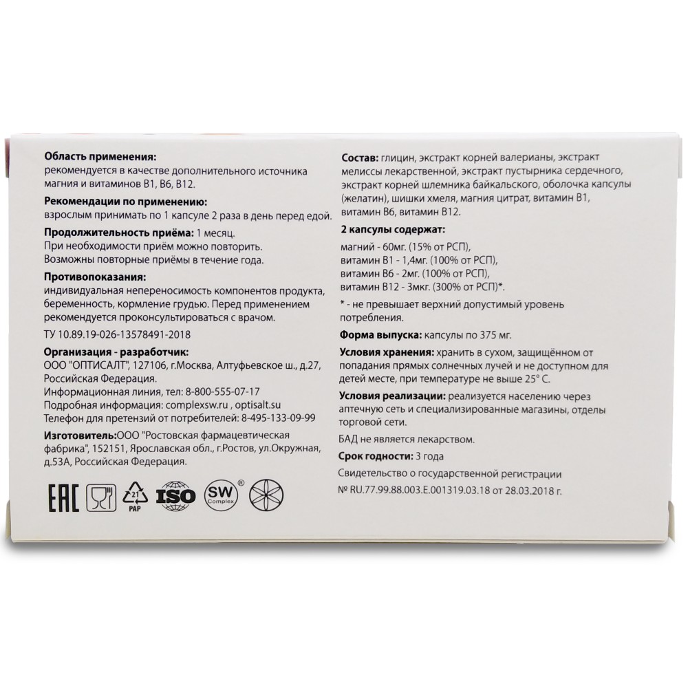 глицин, экстракт корней валерианы, экстракт травы мелиссы лекарственной, экстракт пустырника сердечного, экстракт корней шлемника байкальского, шишки хмеля, магния цитрат, витамины В1, В6, В12, желатин (оболочка капсулы)| 2 капсулы содержат: |